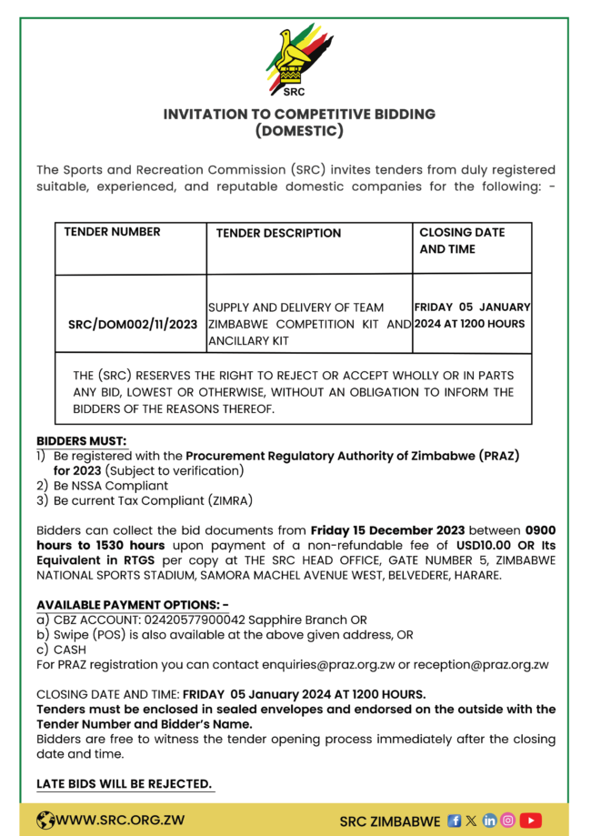 SUPPLY AND DELIVERY OF TEAM ZIMBABWE COMPETITION KIT, ANCILLARY TEAM KIT AND EQUIPMENT